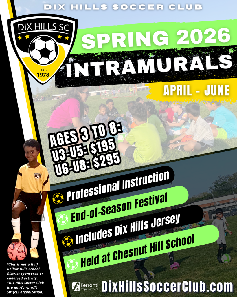 Founded in 1978, the Dix Hills Soccer Club was formed to allow the children of our community to have fun learning and enjoying the game of soccer. The Club’s emphasis is on teaching both girls and boys the meaning of good sportsmanship and how to play soccer as individuals and as members of a team. Soccer demands both dedication and commitment from the players, trainers, and coaches to perform at their best levels. It also demands dedication and commitment from parents to give their children proper training and positive support.